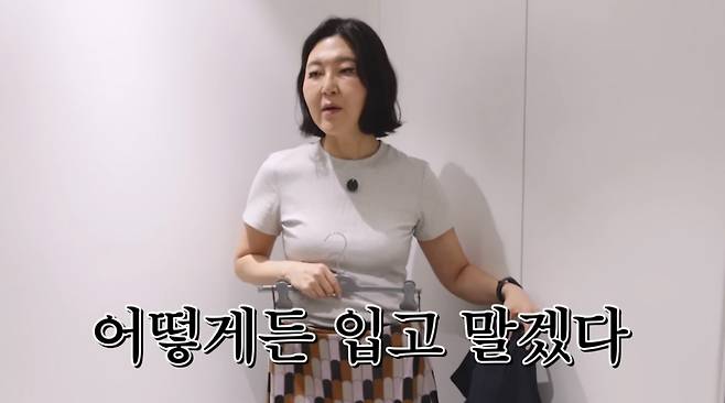 그는 "'내가 어떻게든 살을 구겨 넣을테야' 막 이러면서 샀는데 내가 이거 한 번 입어보겠다"라며 옷을 갈아입고 나왔다.
