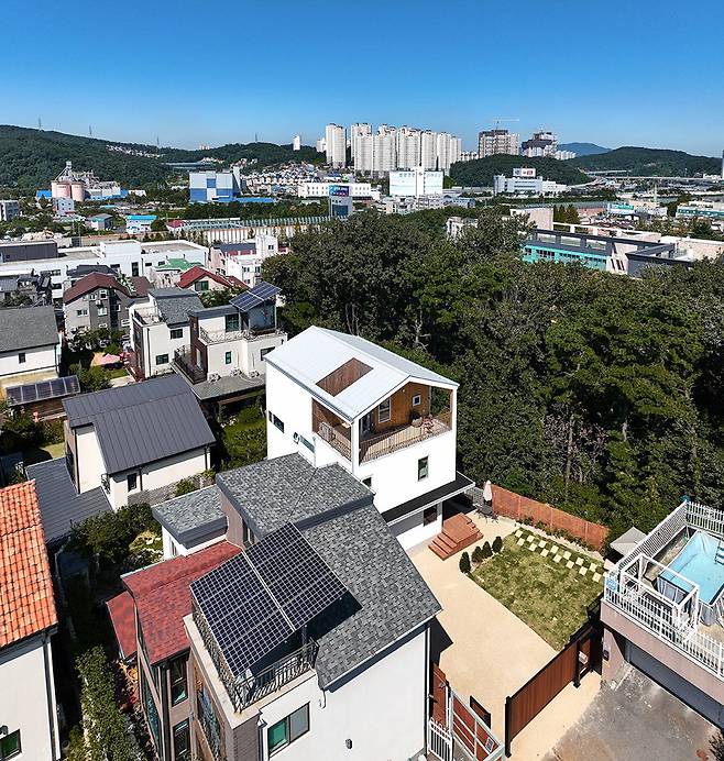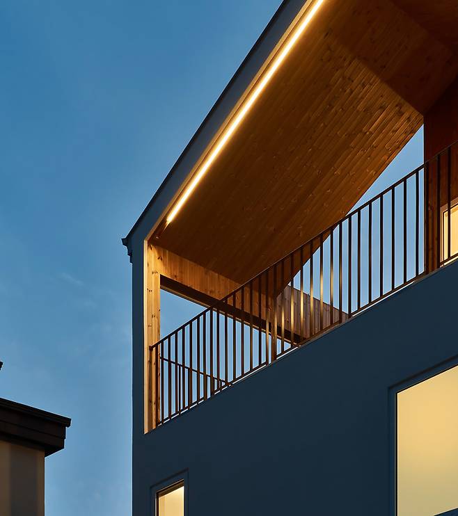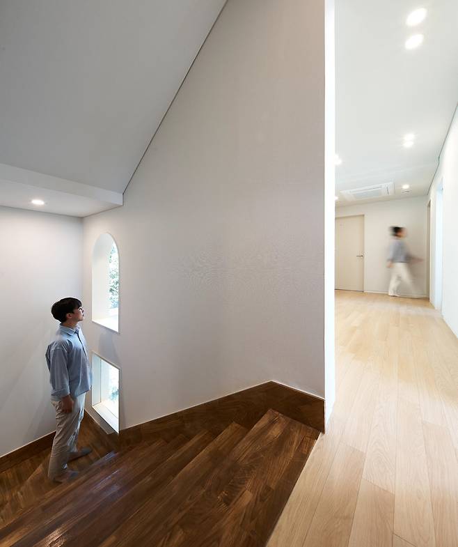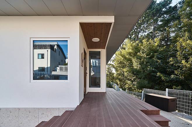 박공지붕은 가족들이 생각하는 집의 형태를 뚜렷이 드러내는 요소이며, 1층 포치 공간과 3층 테라스는 다양한 외부 활동이 가능한 가족만의 아지트이다.