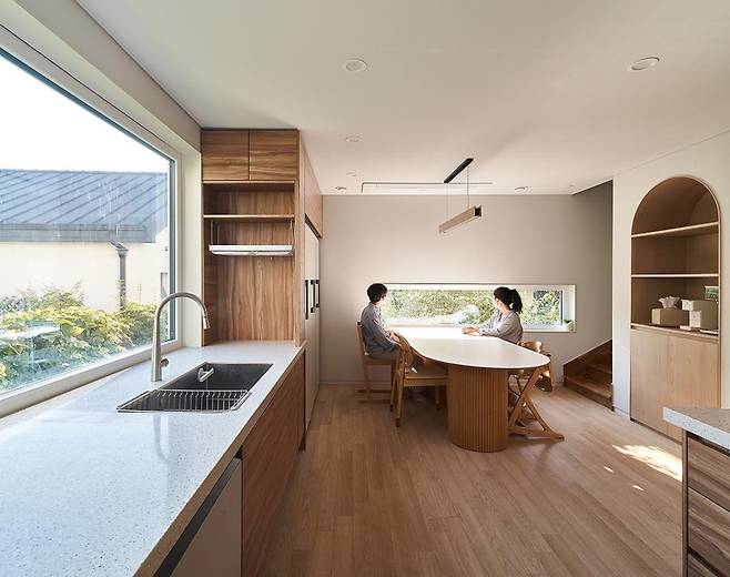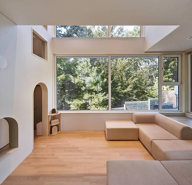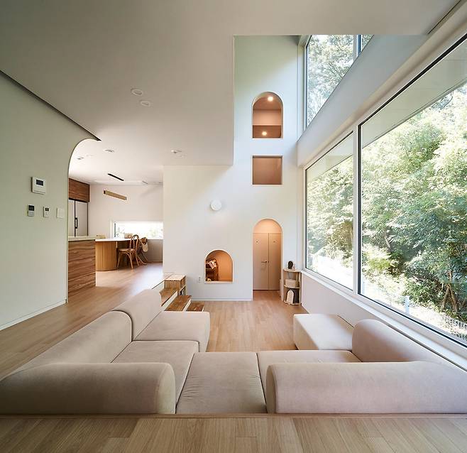 숲을 끌어들여 만든 극적인 경험과 큰 창과 열린 공간으로 더한 개방감. 창 너머로 숲이 펼쳐지는 거실은 사계절의 변화를 느낄 수 있는 따뜻한 공간이며, 채광을 위한 큰 창은 주방을 밝게 물들인다.