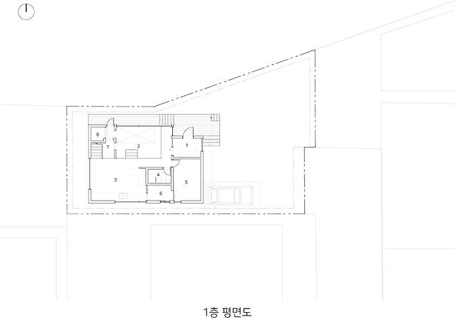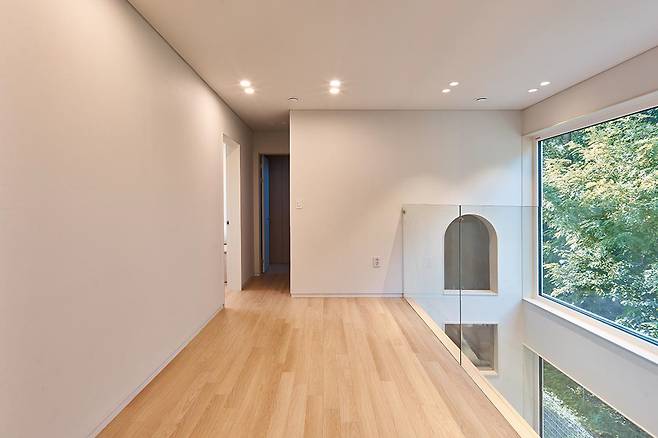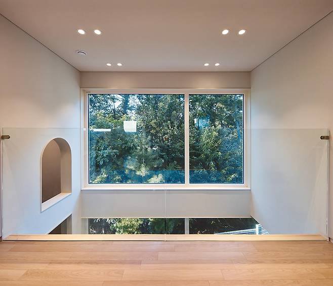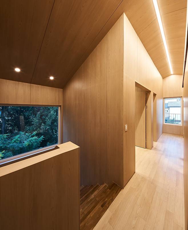 건축가는 숲이 우거진 북쪽 끝자락 땅을 활용하여 공간적 제약을 극복하고자 했다. 집의 경계를 숲에 밀착시켜 극적인 공감각적 경험을 주고, 북측에 큰 창과 열린 공간을 두어 개방감을 더했다.