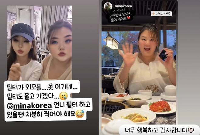 수지 씨는 또 자신의 계정에 “필터가 외모를 못 이기네. 필터도 울고 가겠다. 언니 필터 하고 있을 땐 차분히 찍어야 해요”라며 카메라 필터를 이용해 미나와 찍은 영상을 공개하기도 했습니다. 다만 류필립의 모습은 보이지 않았습니다.