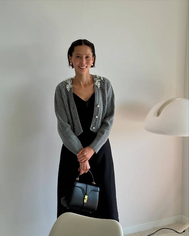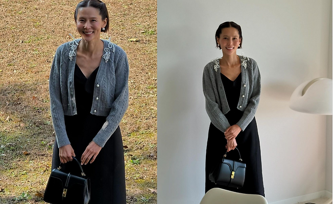 공개 된 사진 속 김나영은 블랙 뷔스티에 롱 원피스를 입고 그레이 가디건을 걸쳐 데일리한 코디를 선보였다. 가디건에 진주로 된 브로치를 착용하여 러블리한 스타일링을 선보였으며, 그레이 컬러의 스타킹을 신고 레드 컬러의 플랫슈즈를 신어 포인트를 주었다. 블랙 미니 핸드백을 들어 단정하면서 깔끔한 코디를 더하였다.
