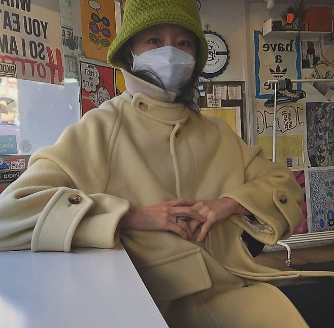 공효진은 연두색 버킷햇에 상큼한 노랑색 발마칸 코트를 입었네요