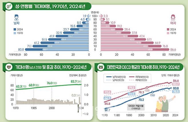 국가데이터처가 3일 발표한 '2024년 생명표'를 보면 지난해 출생아의 기대수명은 83.7년으로 2023년생(83.5년)보다 0.2년 늘었다.