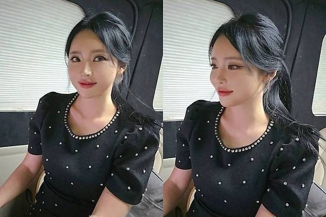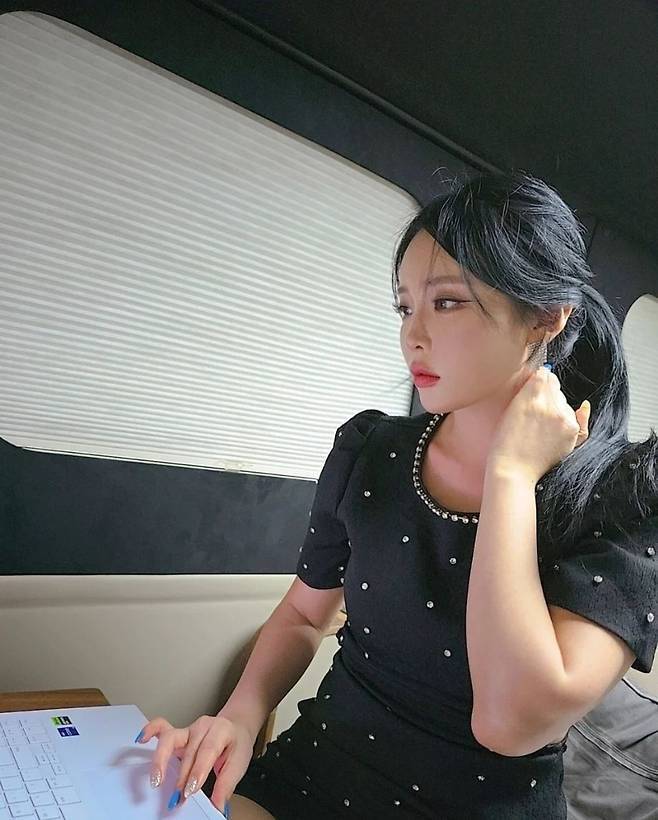홍진영은 웨이브가 말린 긴 머리를 하나로 모아 묶은 포니테일로 연출했습니다.