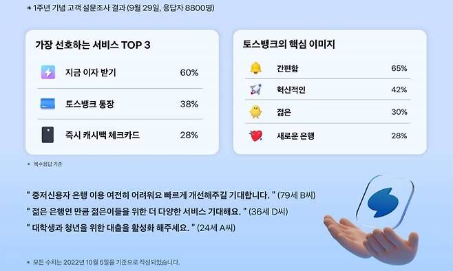 12일 토스뱅크는 출범 1주년을 맞아 대고객 대상 설문조사 결과를 공개했다. 토스뱅크 계좌를 보유하고 있으며, 서비스를 상시 이용하고 있는 고객 8800명이 대상이었다. 고객들은 설문을 통해 지난 1년간 토스뱅크가 제1금융권 은행임에도 '은행'이라는 고정관념을 깨고 고객 관점에서 도전을 이어갔다고 평가했다.