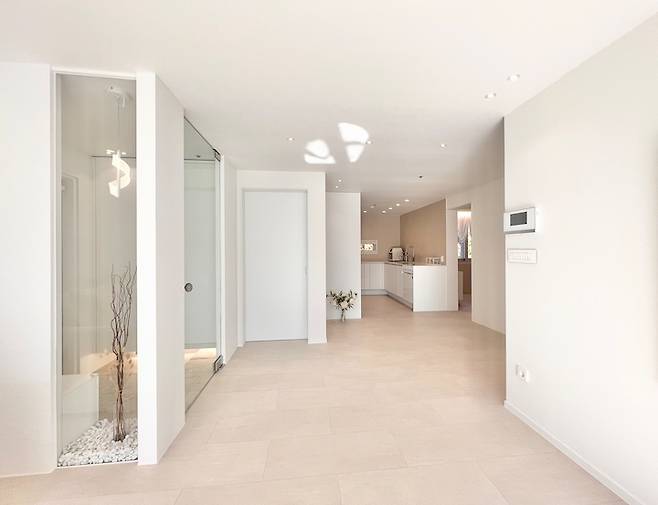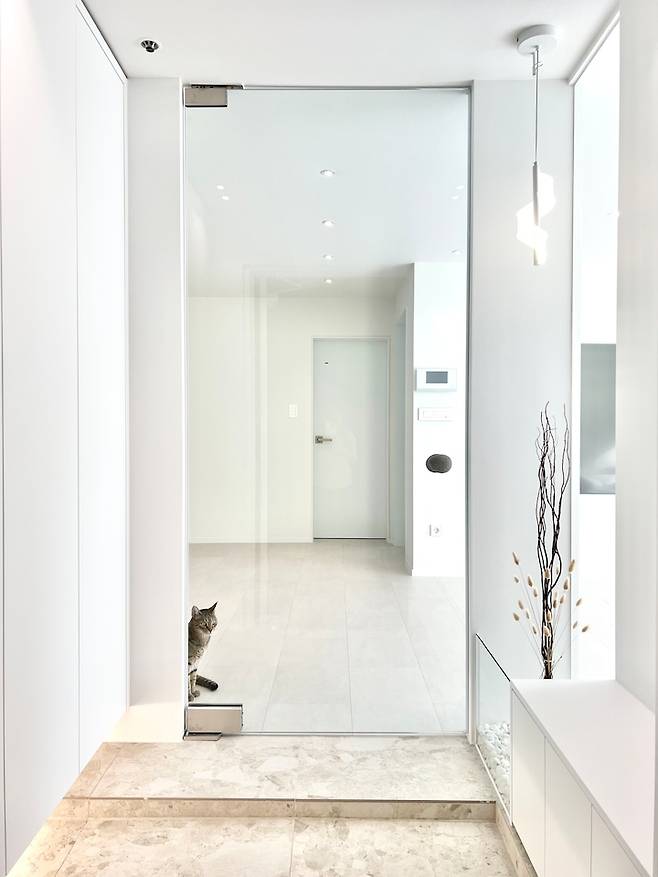 현관부터 정면으로 보이는 화장실까지 시각적으로 길어 보일 수 있게 다운라이트 4발을 수직으로 넣고, 중문은 전체 투명 유리로 개방감을 줬습니다.