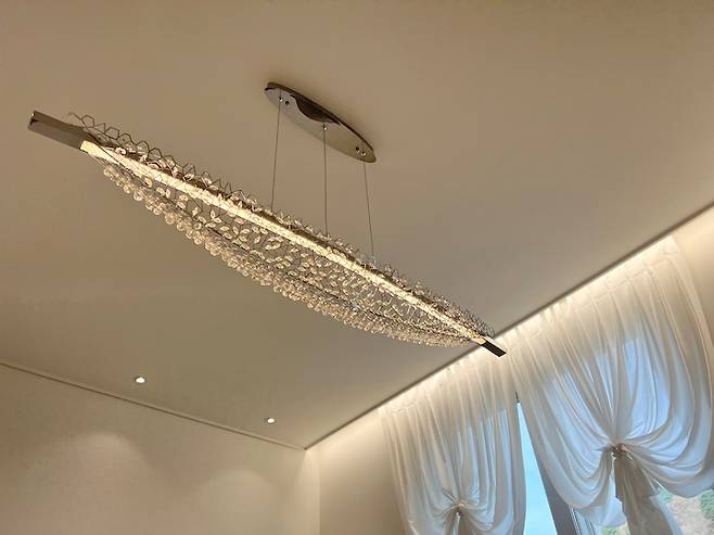 다이닝룸의 조명으로는 가이아크리스탈 LED펜던트를 선택했는데, 몇 달을 고심하여 고른 보람이 있는 제품이에요. 독보적인 존재로 저희 집 물건 중에 가장 화려하고 아름답지만 미니멀한 저희 집과도 멋지게 조화를 이루는 고급지고 세련된 펜던트입니다. 보는 사람마다 모두 칭찬할 만큼 실물로 보면 더욱 아름다워요 :)