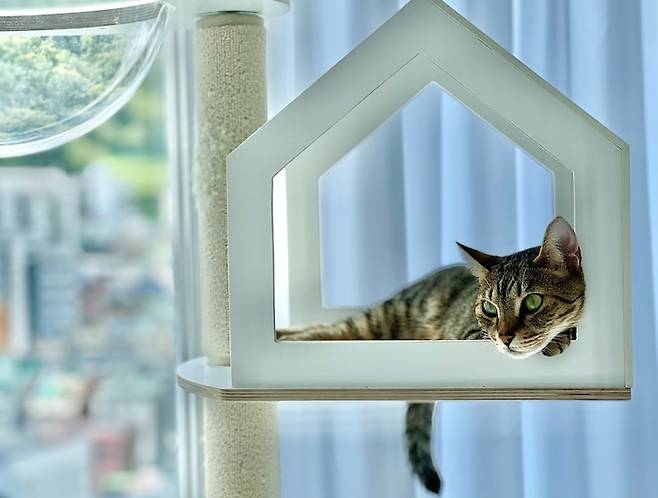 창가에 캣타워를 두어 모모가 햇볕도 쬐고 새들도 구경할 수 있게 했어요. 모모는 창밖 구경하는 것도 좋아 하지만 저를 구경하는 걸 더 좋아해서 제가 소파 카우치에 누워 있으면 바로 위 캣타워에서 저를 구경 한답니다 :) 모모가 사용하는 캣타워는 오브바이포 상품입니다. 캣타워가 너무 이뻐서 제가 후기를 마구마구 남겼더니 오브바이포 홈페이지의 베스트 리뷰가 되어 있더라구요 ㅎㅎ