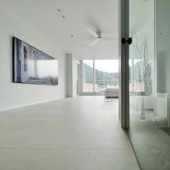 무문선 시공에 거실과 화장실 바닥색을 통일해서 깔끔하고 연장된 느낌으로 인테리어 했어요.