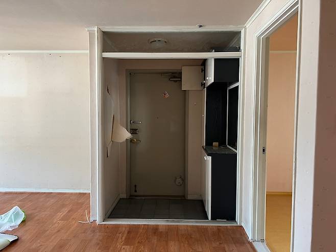 현관 옆 가벽을 철거하고 현관을 넓히면 거실 공간이 줄어 들기 때문에 커다란 소파를 뒀을 때 거실이 좁아 보이는 게 싫어서 중문과 작은방 사이의 공간만큼만 현관을 앞으로 당겨 그 공간에 발 디딤판을 만들었답니다.