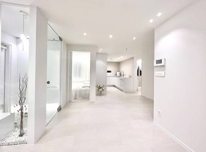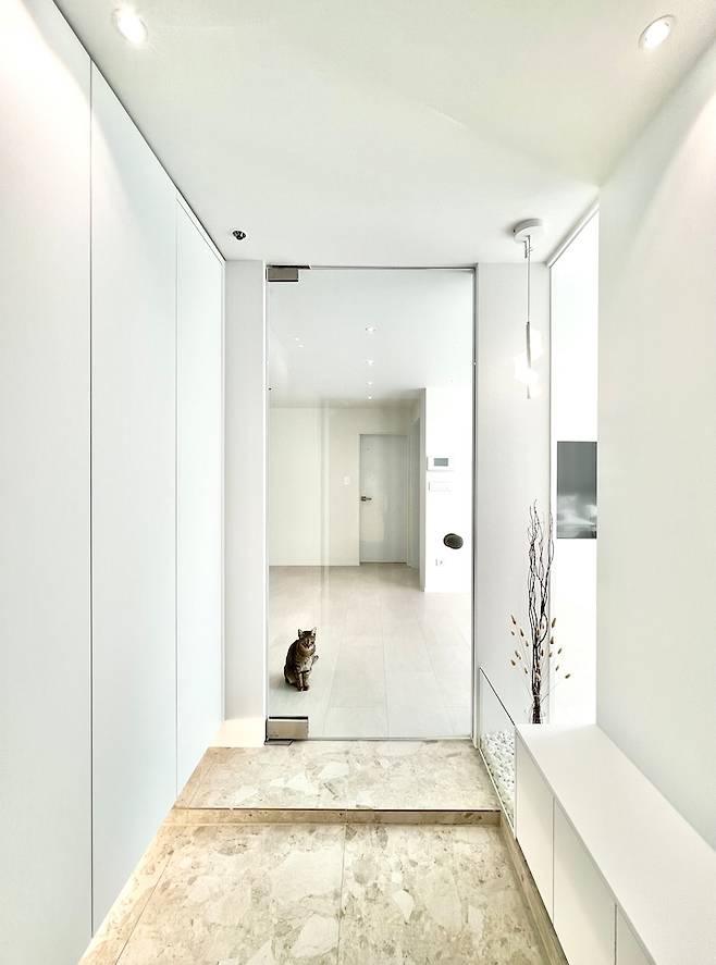 현관부터 정면으로 보이는 화장실까지 시각적으로 길어 보일 수 있게 다운라이트 4발을 수직으로 넣고, 중문은 전체 투명 유리로 개방감을 줬습니다.