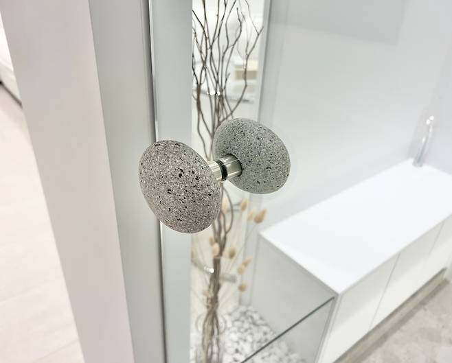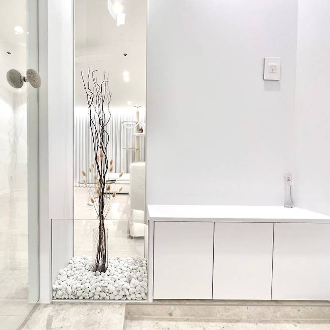 현관은 가장 신경 쓴 공간이에요. 측면으로 길게 유리 파티션을 세웠고, 그 옆에 작은 벤치와 소품을, 아래로는 수납을 만들어 가위, 빗자루,물티슈등 택배 박스를 열거나 현관 청소시 바로 쓸 수 있는 물건들을 보관해요. 중문에 달린 귀여운 돌 손잡이 찾으셨나요? ^^ 돌손잡이, 백자갈, 버드나무처럼 작지만 임팩트 있는 아이템으로 세련된 현관 분위기를 연출했어요.