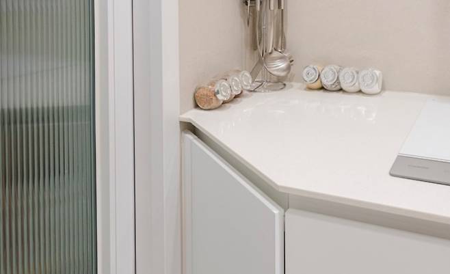 주방에서 발코니로 나가는 통로 간격이 좁아 대각선으로 싱크대를 마무리했어요. 실장님 추천으로 했는데 정말 마음에 들어요. 실장님 감사드려요 :)