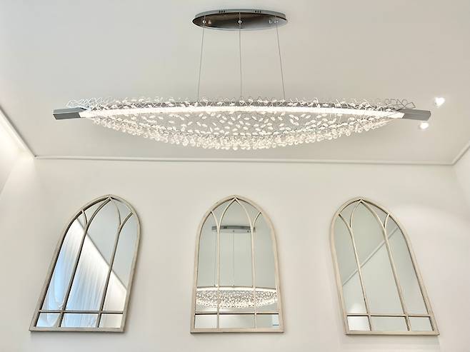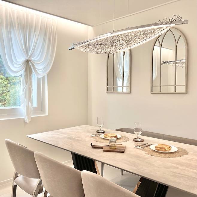 다이닝룸의 조명으로는 가이아크리스탈 LED펜던트를 선택했는데, 몇 달을 고심하여 고른 보람이 있는 제품이에요. 독보적인 존재로 저희 집 물건 중에 가장 화려하고 아름답지만 미니멀한 저희 집과도 멋지게 조화를 이루는 고급지고 세련된 펜던트입니다. 보는 사람마다 모두 칭찬할 만큼 실물로 보면 더욱 아름다워요 :)