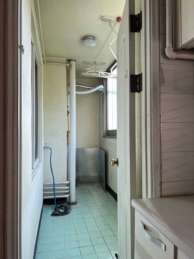 터닝도어를 열면 침실 창과 연결된 확장하지 않은 베란다가 나와요. 세탁기 들어갈 자리가 마땅치 않아 우수관 뒤로 보이는 보일러 위치를 터닝도어 정면으로 옮기고 겨우 겨우 세탁기를 설치 했습니다.