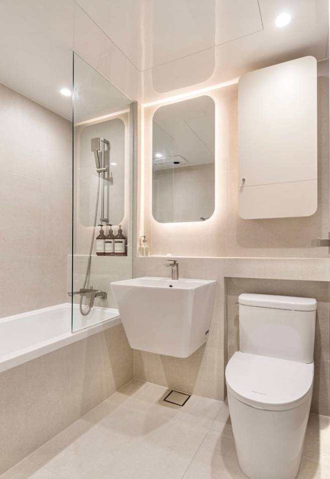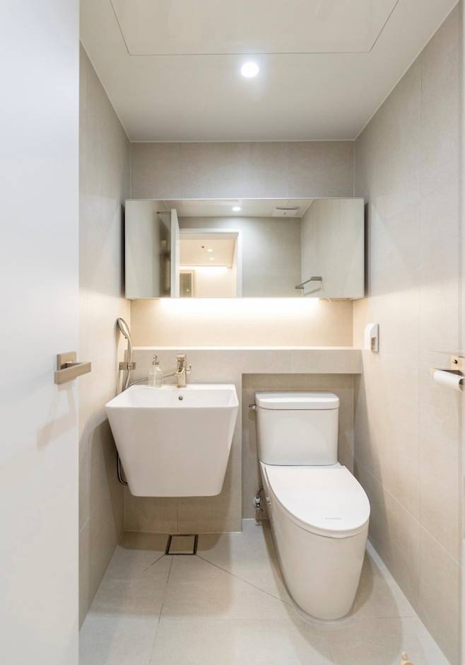 타일은 거실과 색상을 통일하여 아이보리로 하고 거울과 수건장도 모서리가 둥글게 마감된 디자인으로 선택해 부드러운 느낌을 더 했어요.