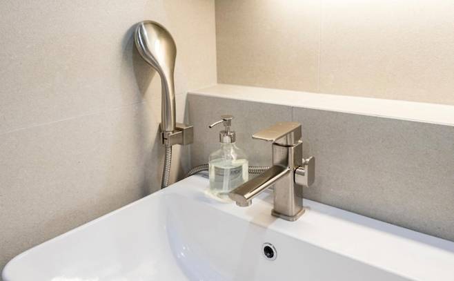 그래도 꼭 필요한 건 다 있어야겠죠? 샤워는 주로 공용화장실에서 하지만 손님이 오시면 샤워기도 꼭 있어야 해서 세면 수전과 연결해서 설치했어요. 위쪽으로 높이 달면 거울에 시야가 가려지니 깔끔하게 아래 쪽으로!