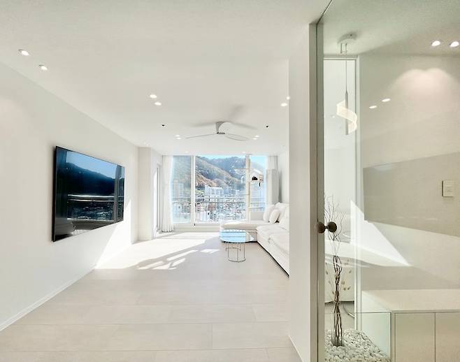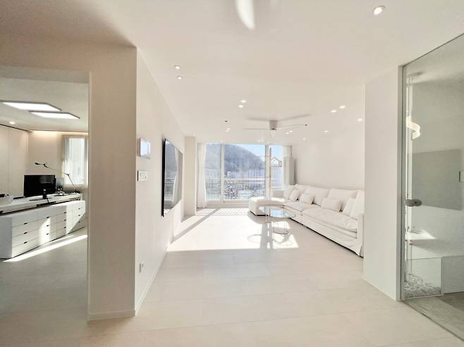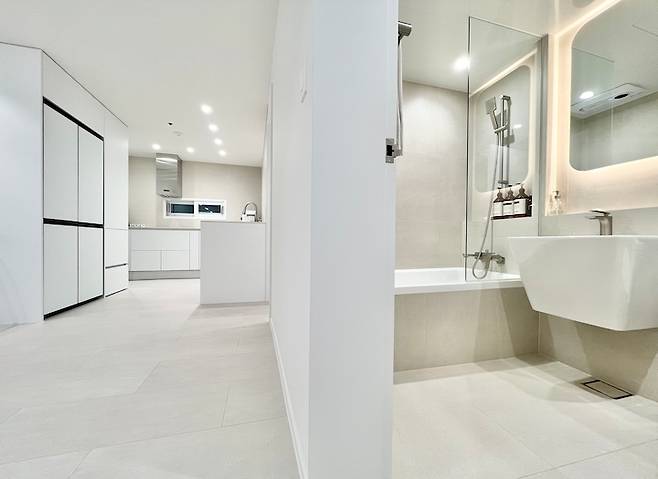 무문선 시공에 거실과 화장실 바닥색을 통일해서 깔끔하고 연장된 느낌으로 인테리어 했어요.