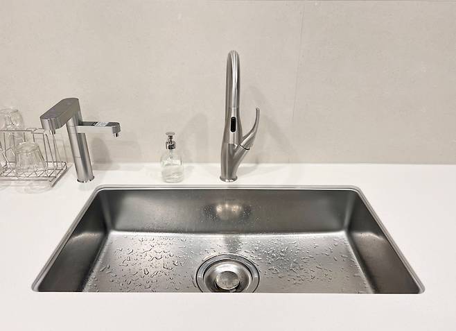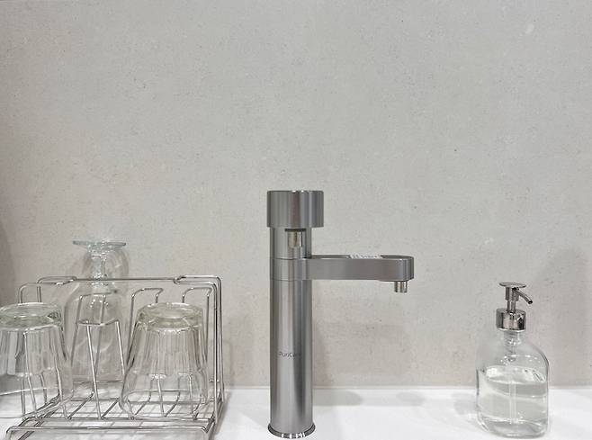 정수기 왼쪽으로는 다이소 식기 건조대 오른쪽으로는 이케아 디스펜서입니다.