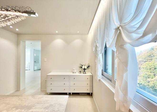 방문을 없애고 오픈룸으로 만들었더니 근사한 공간이 되었답니다. 프렌치한 아치 거울과 대형 팬던트로 화려하지만 깔끔하게 꾸며 봤어요. 커튼 박스 조명을 시공해 한층 분위기를 더 해 줍니다.
