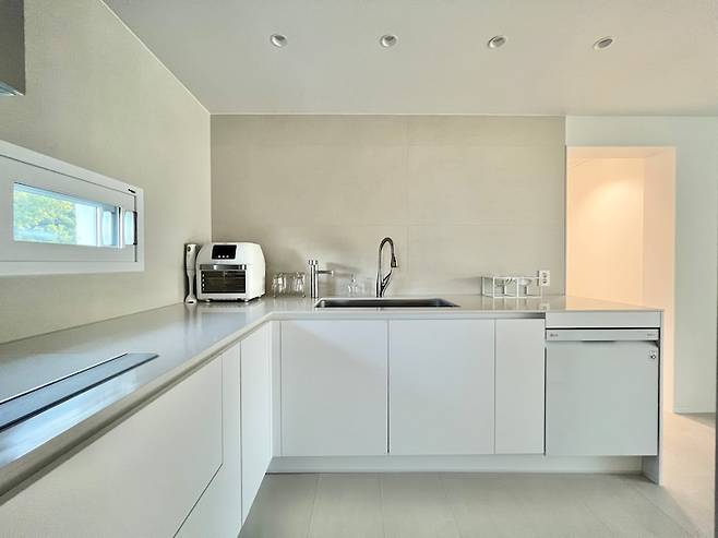 상부장이 없으니 쾌적하네요. 왼쪽에 있는 에어프라이기는 대용량 오븐형으로 구매했어요. 생각보다 청소하기도 쉽고 두가지 음식을 한번에 조리할 수 있으니 그것도 너무 좋아요. 식기세척기는 필수템인 만큼 역시나 만족스럽습니다. 인덕션은 처음 써보는데 청소하기 너무 편해요. 그게 가장 큰 장점이에요~ 손쉽게 깔끔한 주방을 유지 할 수 있다는 것! 굿굿!!