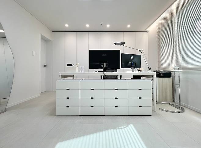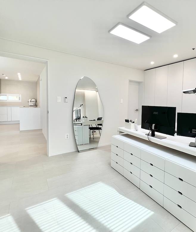 화장대를 따로 만들지는 않았지만 서재/드레스룸에서 화장을 해요. 서재 조명은 주광색, 주백색, 전구색을 편의에 따라 변경할 수 있어요. 화장할 때는 주광색, 작업할 때는 주백색, 쉴 때는 전구색으로 디밍할 수 있답니다!