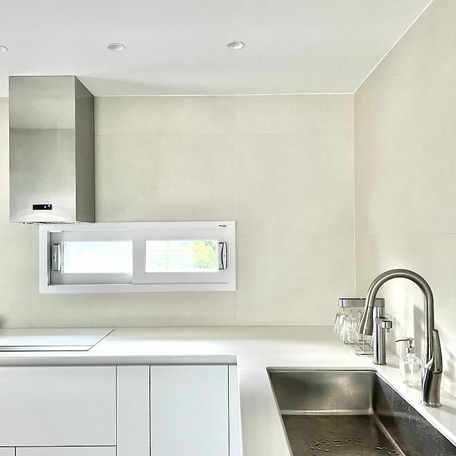 수전은 더죤테크 슈티에391 니켈 제품으로 인테리어 실장님께서 물이 덜 튄다고 추천해 주셨는데 이쁜건 덤이에요. 후드는 하츠 스퀘어후드입니다 ^^