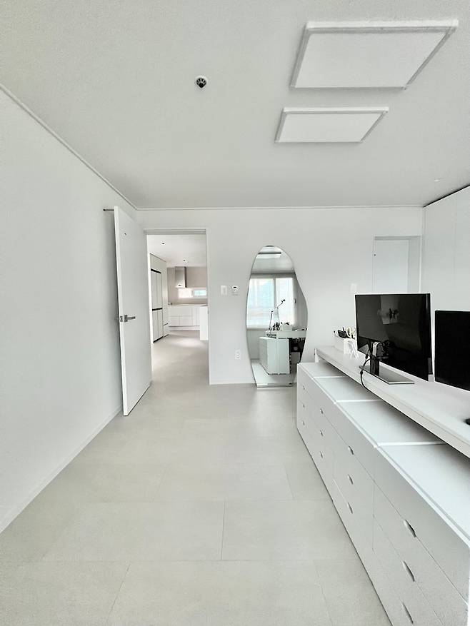 영화 보는 걸 너무 좋아하는 저희는 TV 없는 거실은 생각하지도 않았죠. 아트월이 더 넓었더라면 더 큰 TV를 설치했을 거예요. 삼성 85인치 벽걸이 TV인데 매장 가격 보다 인터넷이 저렴해서 인터넷으로 주문했고 인테리어 공사 할 때 미리 만들어 놓은 브래킷 홈 안으로 TV만 보이도록 설치 했더니 보시는 분들마다 갤러리 같다고 많이 칭찬해 주십니다.