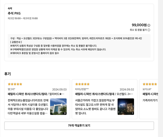 이번 비발디파크 오션월드 평일 추석패키지는 단순히 숙박만 제공하는 것이 아니라, 오션월드 입장권과 놀이기구 이용권까지 포함된 종합적인 패키지입니다. 특히 성인 3인 기준 99,000원이라는 합리적인 가격에 이러한 혜택을 제공받을 수 있다는 점에서 매우 매력적입니다.