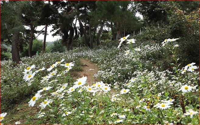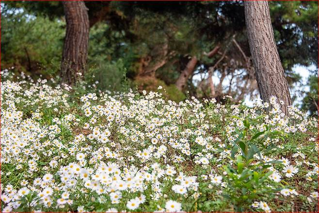 가을의 장군산은 다른 어떤 계절보다도 아름답습니다. 산사 입구부터 영평사 주변까지 3만 평이 넘는 구절초 군락지가 하얀 물결처럼 이어지며 장관을 이루지요. 맑은 가을 햇살 아래 흔들리는 구절초는 멀리서 보면 눈이 소복이 내린 듯 고요하고, 가까이 다가가면 은은한 향이 바람결에 스며듭니다. 구절초는 우리나라를 대표하는 토종 야생화로,‘선모초(仙母草)’라 불리기도 합니다.