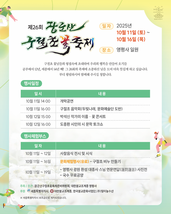 가을이면 세종 장군산 자락이 하얀 꽃물결로 뒤덮입니다. 마치 첫눈이 내린 듯 산자락이 하얗게 물드는 이 계절, 그곳에서는 매년 ‘장군산 구절초꽃축제’ 가 열립니다. 2025년 올해로 제26회를 맞이하는 이 축제는 10월 11일(토)부터 10월 16일(목)까지 6일간 세종시 장군면 영평사 일원에서 개최됩니다. 지금이 바로, 하얀 구절초가 절정을 이루는 시기입니다.