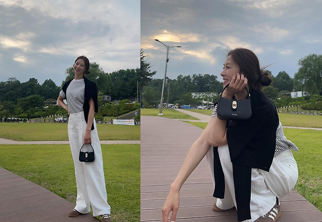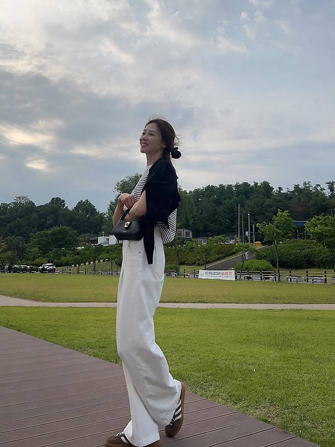 공개된 사진 속 장신영은 심플한 블랙&화이트 스트라이프 티셔츠에 와이드한 화이트 팬츠를 매치해 기본템만으로도 감각적인 데일리룩을 완성했다.