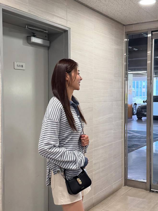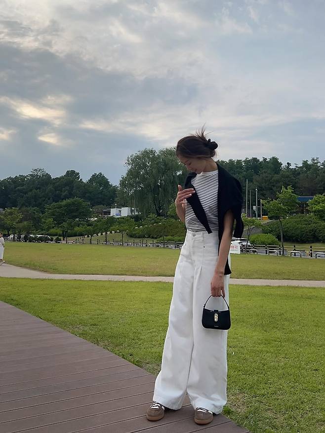 여기에 블랙 니트를 어깨에 걸쳐 포인트를 주고, 미니 핸드백과 샌들로 마무리하며 실용성과 스타일을 모두 챙긴 모습이다.