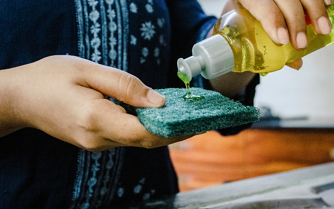 기름때는 물보다 세제가 먼저 닿아야 효과적으로 제거됩니다. 세제 속 계면활성제가 기름 분자를 분리하고 표면에서 떨어뜨리는 역할을 하기 때문에, 마른 상태의 그릇에 세제를 직접 뿌린 뒤 씻으면 기름이 훨씬 빨리 사라집니다. 이렇게 하면 뜨거운 물이나 긴 헹굼 없이도 깔끔하게 세척할 수 있습니다.
