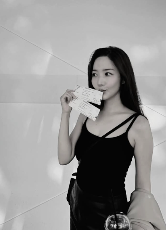 두 번째 사진에서는 슬림한 블랙 슬리브리스 톱과 하이웨이스트 스커트를 매치해 전체적으로 바디라인이 강조된 시크한 룩을 보여준다.