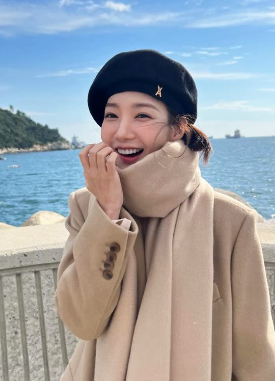 세 번째 사진은 바다를 배경으로 한 따뜻한 겨울 패션이 돋보인다.