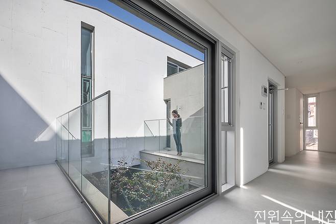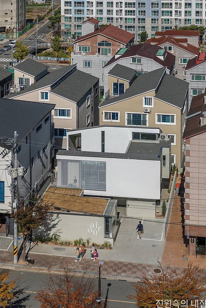 거제도 조선산업 배후 주거지 역할을 하는 아주택지개발지구에 주변 다세대주택들과는 사뭇 다른 집이 있다. 1층은 노출콘크리트, 2층 전면은 흰색 페인트로 마감한 건축물이다. 중정으로 진입하면 부부가 운영하는 작지만, 외부 공간이 여유로운 카페가 있고, 철문을 지나 계단을 올라가면 세 가족을 위한 중정을 품은 세상을 만날 수 있다.