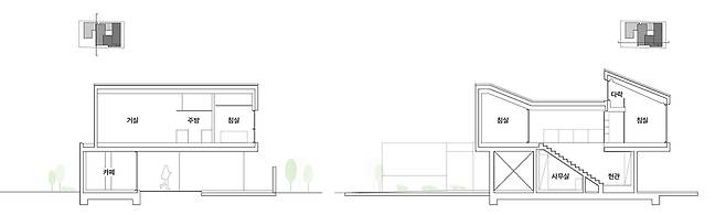 특히 이 건축물의 특이한 점은 카페의 부대 시설, 사무실, 주택 출입구가 하나의 매스로 이루어져 있다는 것이다. 용도에 따라 각 영역이 분리되어 있으면서도, 사용자를 위해 사무실을 중심으로 카페와 주택이 모두 연결된 것이다. 2층에는 도로에 면한 전면부에 거실 등 가족들의 공적 공간, 후면부에 프라이버시를 보호할 수 있는 사적 공간을 배치했다. 이로써 부부와 아이가 함께, 나아가서는 이웃들과도 함께 하는 주택이 완성됐다.