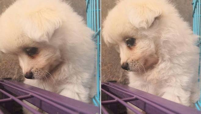 그 모습을 보고 발걸음이 떨어지지 않았던 누리꾼은 며칠 후 다시 펫샵을 찾았습니다. 다행히 강아지는 펫샵 안에서 보호받고 있었지만, 그 작은 몸은 슬픔에 잠겨 있었습니다.