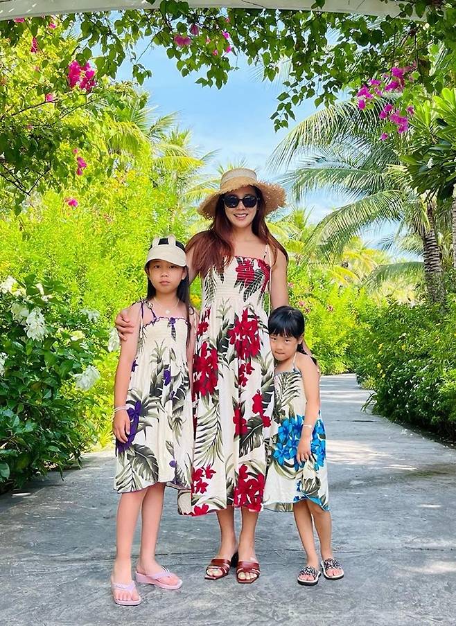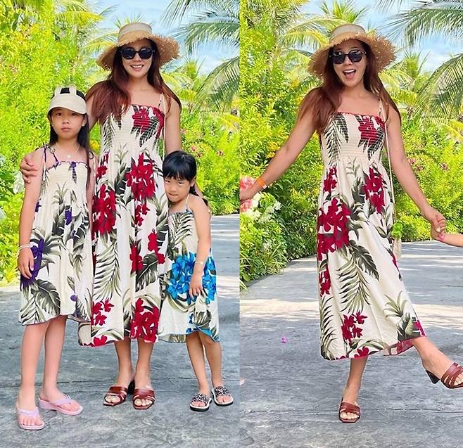 그룹 S.E.S 출신 배우 유진이 두 딸들과 함께 꽃무늬 원피스로 예쁜 패밀리 리조트룩을 완성했다.
