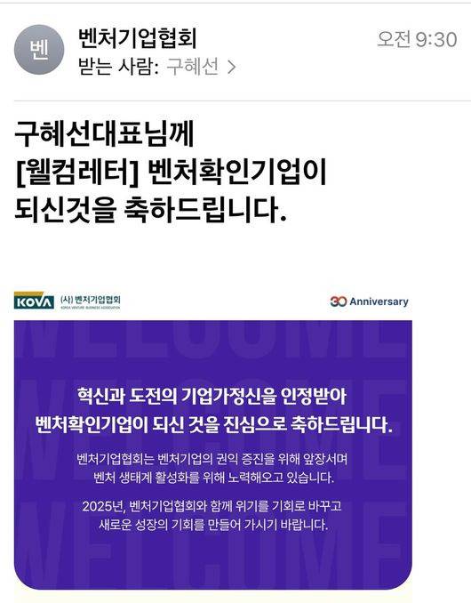 공개된 사진에는 벤처기업확인기관장의 도장이 찍힌 ‘예비벤처기업확인서’와 벤처기업협회에서 받은 웰컴레터가 포함돼 눈길을 끌었다.