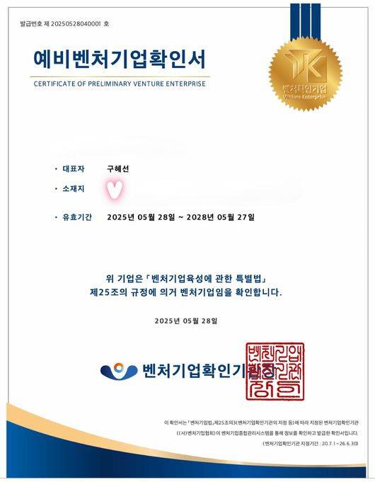 이 확인서는 2025년 5월 28일부터 2028년 5월 27일까지 유효하며, 구혜선이 벤처기업으로서 자격을 갖추고 본격적인 창업 활동을 시작하게 됐음을 보여준다.