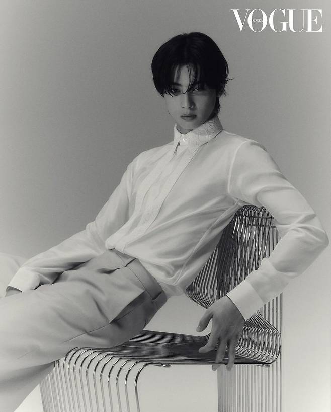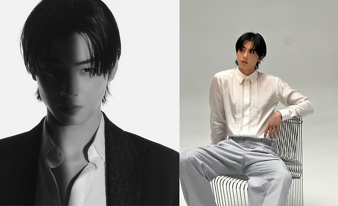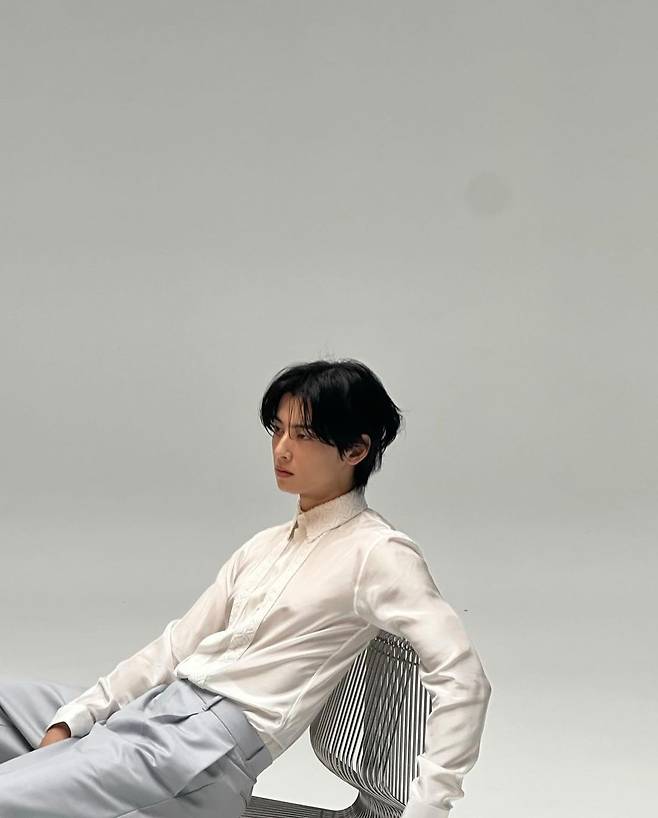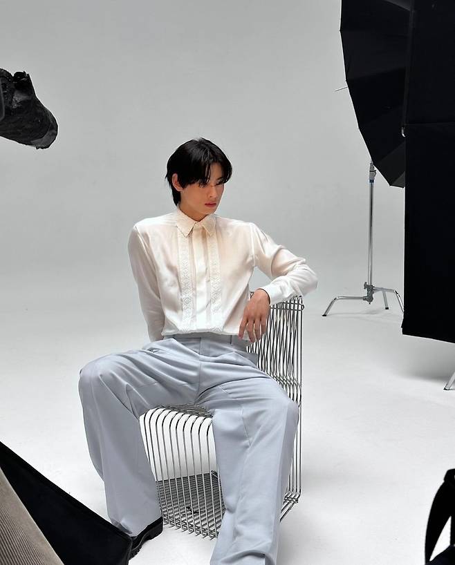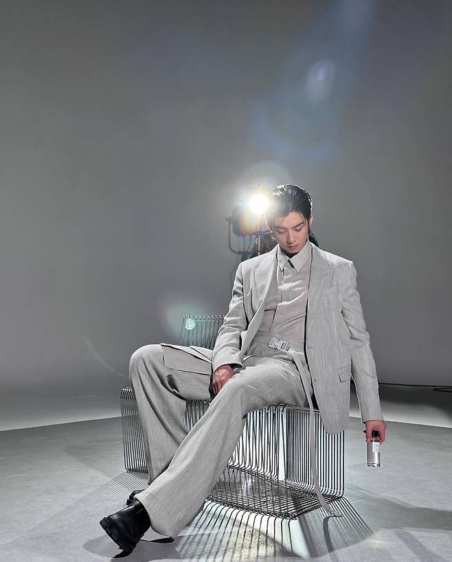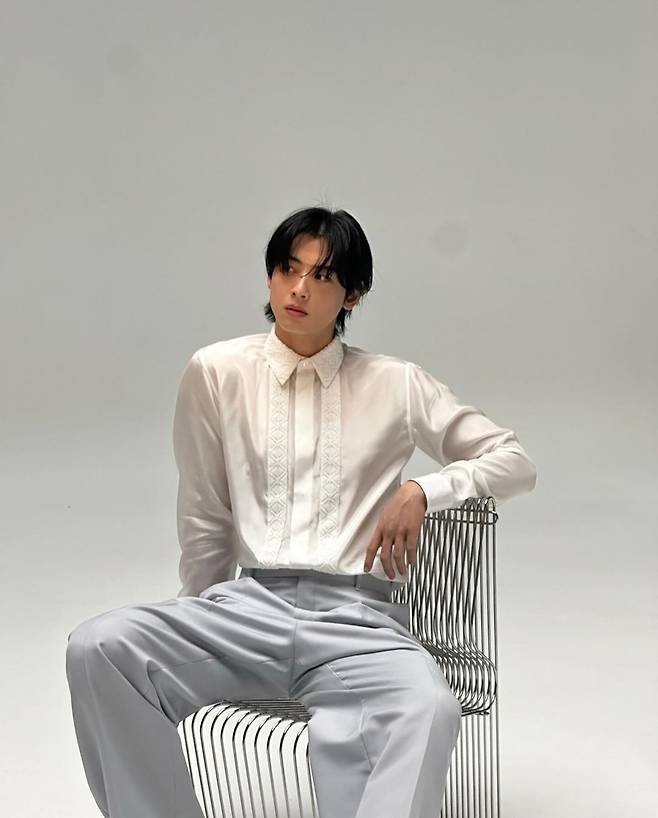 사진 속 차은우는 카라와 중앙에 자수패턴이 있는 흰셔츠와 그레이 팬츠를 입고 멋진 아우라를 뿜어냈다. 또 다른 사진에서는 그레이톤 정장 셋업을 입고 풀어헤친 모습과 또 단정하게 단추를 여며 멋진 정장핏을 선보였다.