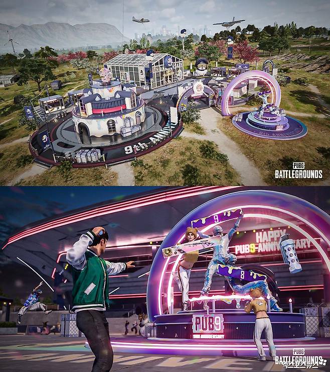 한편, '배틀그라운드' 게임 내에서도 9주년 축제가 펼쳐지고 있다. 먼저, 시작섬에 9주년 기념 동상이 세워졌다. 매치 시작 전 동상을 향해 홀로그램 섬광탄을 던져 9번 명중시키면 동상이 해당 이용자의 모습으로 변하며, 하늘에는 9주년 기념 드론쇼가 펼쳐진다. 또한 접속만 해도 무료로 획득할 수 있는 '이벤트 패스: 올 데이 파티'를 제공한다. 미션 달성을 통해 '올데이 프로젝트' 아이템, 이모트, 지코인(G-Coin), BP 등 여러 보상을 얻을 수 있다.