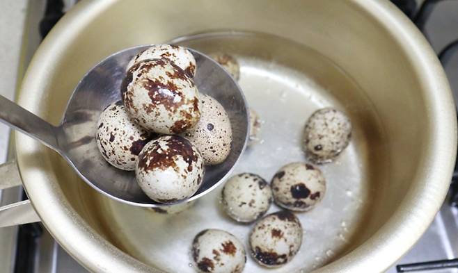 물이 끓으면 약불로 줄이고 5분간 삶아주세요. 다 삶은 메추리알은 찬물에 바로 넣어 열기를 식혀주세요. 식은 후 껍질을 벗기면 깔끔하고 매끄럽게 잘 벗겨집니다.