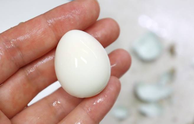 삶은 후 찬물에 바로 헹궈야 껍질이 수월하게 벗겨져요. 또 하나의 팁은 물속에서 알 껍질을 까면 상처없이 쉽게 깔 수 있어요.