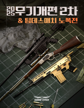 이와 함께 팀데스매치 커스텀모드에 투척무기 없이 대결하는 '노폭전'을 추가하고 6월 12일까지 기념 이벤트를 진행한다. 이벤트 기간 팀데스매치 '노폭전' 플레이 등 각종 챌린지 퀘스트 완료 시 개편 대상 무기를 비롯해 경험치, 패스티켓을 선물한다. 또, 모든 퀘스트를 완료한 이용자에게는 500 SP, 10만 경험치, '패스티켓 10개'를 추가로 지급한다.