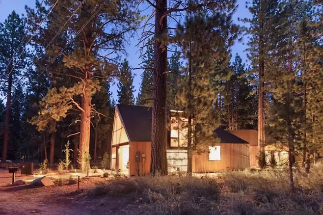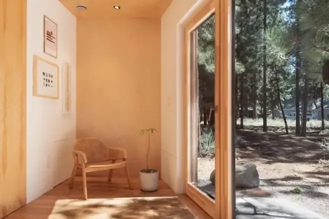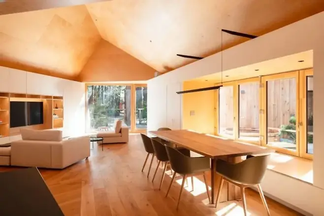 실내로 들어서면 따뜻한 원목 마감재가 공간 전체를 감싼다. 바닥에서 천장까지 이어지는 커다란 창문은 숲의 풍경을 끌어들이고, 경사가 있는 지붕의 불규칙한 채널은 햇빛을 받아들이는 방식에서도 남다르다.