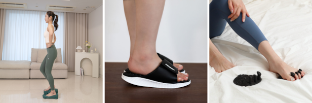 리압슬리퍼는 단순한 슬리퍼가 아니라, 걸을 때마다 발을 지압해 혈액순환을 돕는 제품이다. 오래 서 있거나 다리가 자주 붓는 이들에게 적합한 제품이다. 리압토즈는 발가락을 벌려 혈액순환과 무지외반증 등으로 인한 발가락 틀어짐 교정을 돕는 생활 도구다. 스트레칭 할 때 함께 사용하면 효과적이다.